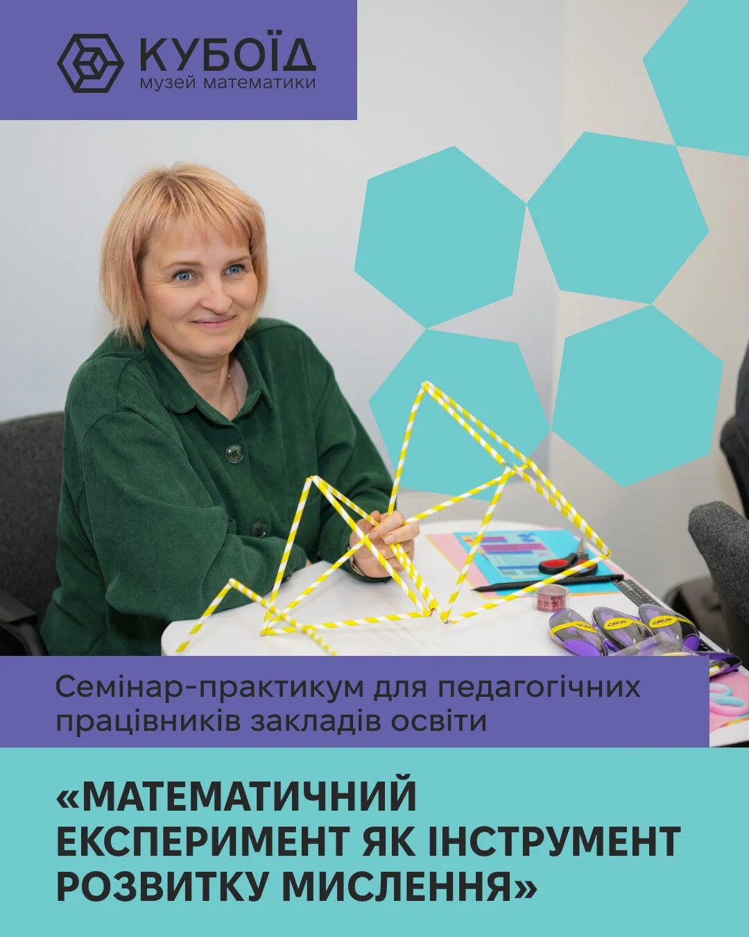 Семінар відбудеться наживо у науково-освітньому просторі «Музей математики “Кубоїд”» за адресою: м. Київ, просп. Академіка Глушкова, 1, павільйон № 3 (літера «В»).